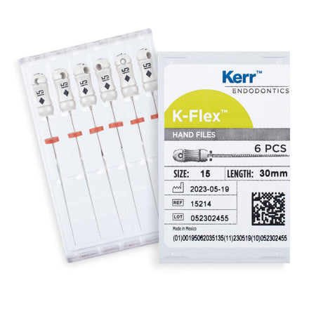 Kerr K-Flex Files are premium stainless steel endodontic hand files designed for shaping and enlarging root canals with control and precision. Their unique rhomboid cross-section provides excellent cutting efficiency while maintaining flexibility, allowing safe negotiation of curved canals. Available in multiple lengths, K-Flex Files are a reliable choice for clinicians seeking efficiency, safety, and consistent results.
