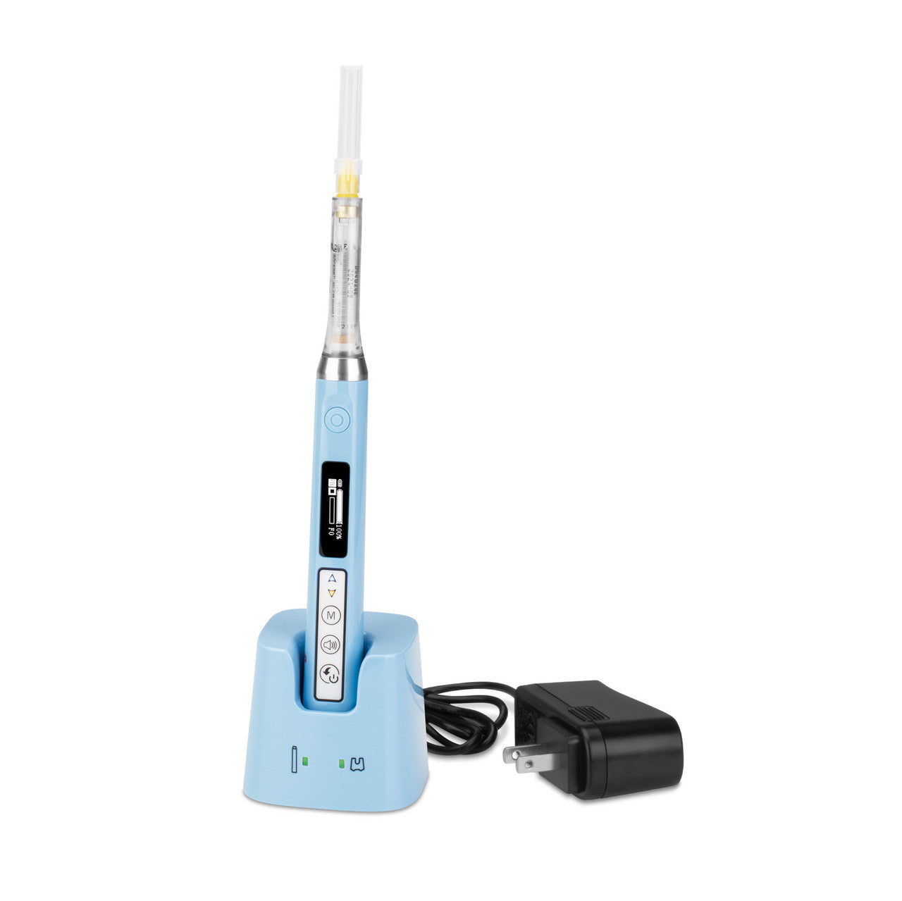Suitable for all anesthesia techniques including infiltration, block, palatal, and PDL. Works with all standard 1.8cc anesthetic cartridges and standard US dental needles. Transparent plastic cartridge holders are steam autoclavable to 273°F. Handpiece may be surface disinfected. One year warranty. Complete with pastel blue handpiece, eight cartridge holders, and 5V DC cordless recharging base.