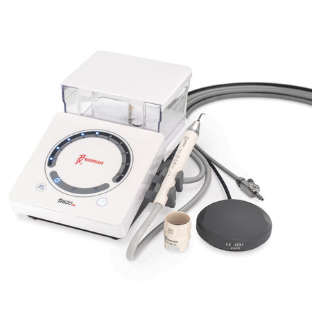 The Woodpecker U600 LED Piezo Ultrasonic Scaler packs functionality and value into one self-contained unit. Perform normal ultrasonic scaling with the added ability to switch frequency levels for endo and perio procedures. Sine wave drive optimizes treatment comfort. LED handpiece illuminates the point of contact for optimum visualization. Handpiece remains lit for 10 seconds after foot pedal is released. Seamless, light touch control panel. On-board water reservoir with adjustable water flow. Compatible with all piezo ultrasonic scaling tips. Includes five ultrasonic scaling tips, two endo tips, foot pedal, and water reservoir. One year warranty.